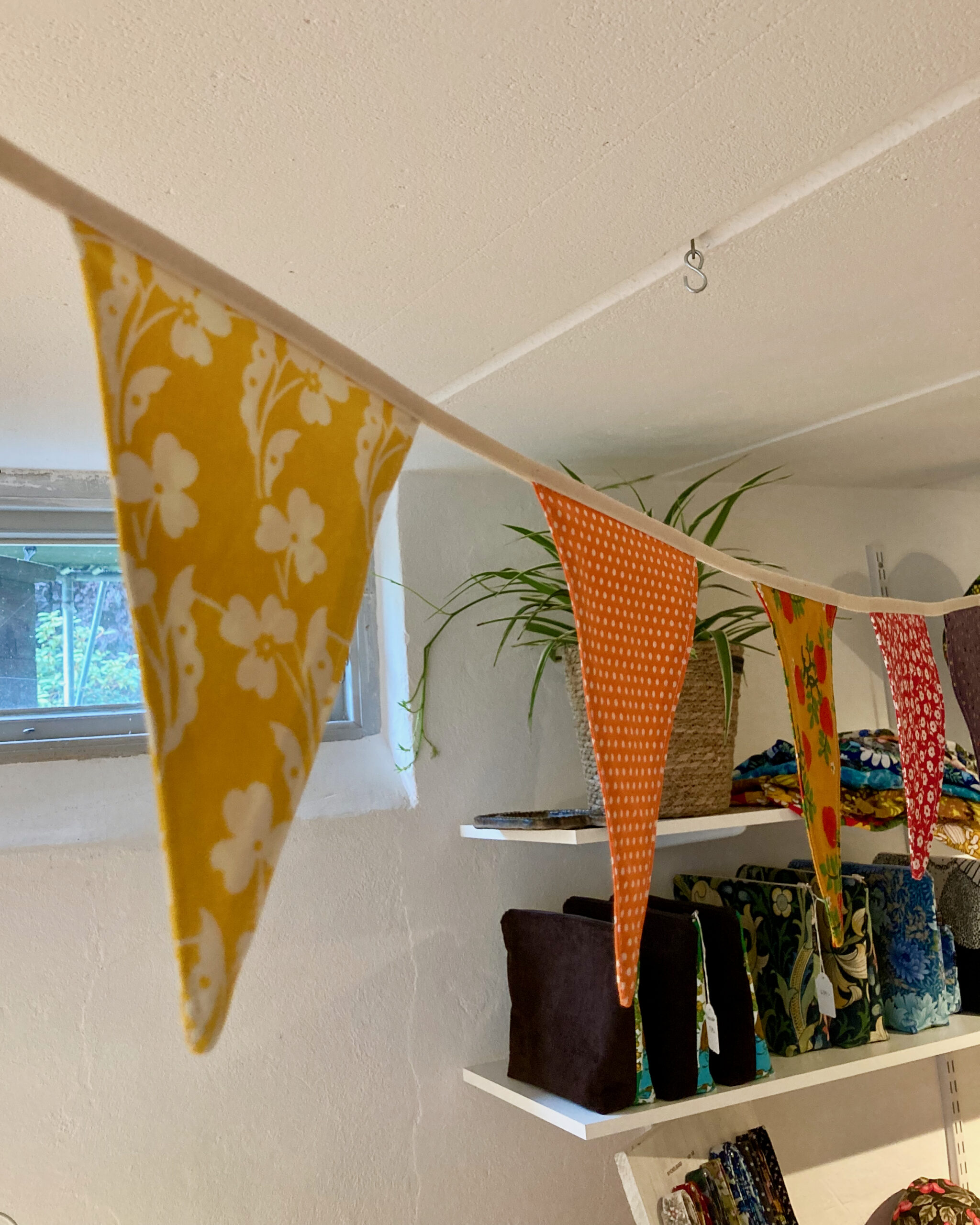Flaggspel med 10 st vimplar sydda i retrotyger i regnbågens alla färger! Detta flaggspel passar som dekoration varhelst det behövs piffas till med lite färg, eller varför inte som ögongodis över festbuffén?